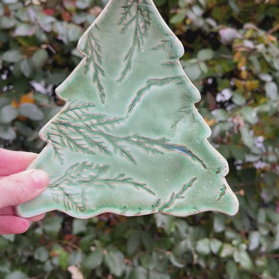 White stoneware clay with pressed cypress boughs featuring a combination glaze of white and turquoise.