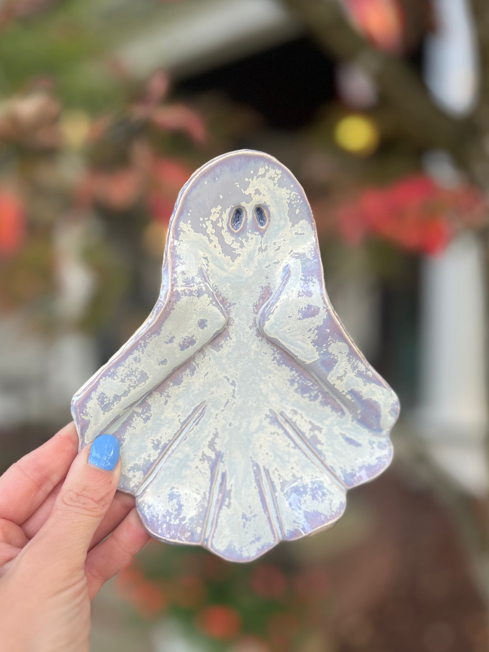 The White Ghost features a glaze that breaks incandescent white while the Lavender Ghost is texturized with a transparent lavender glaze.