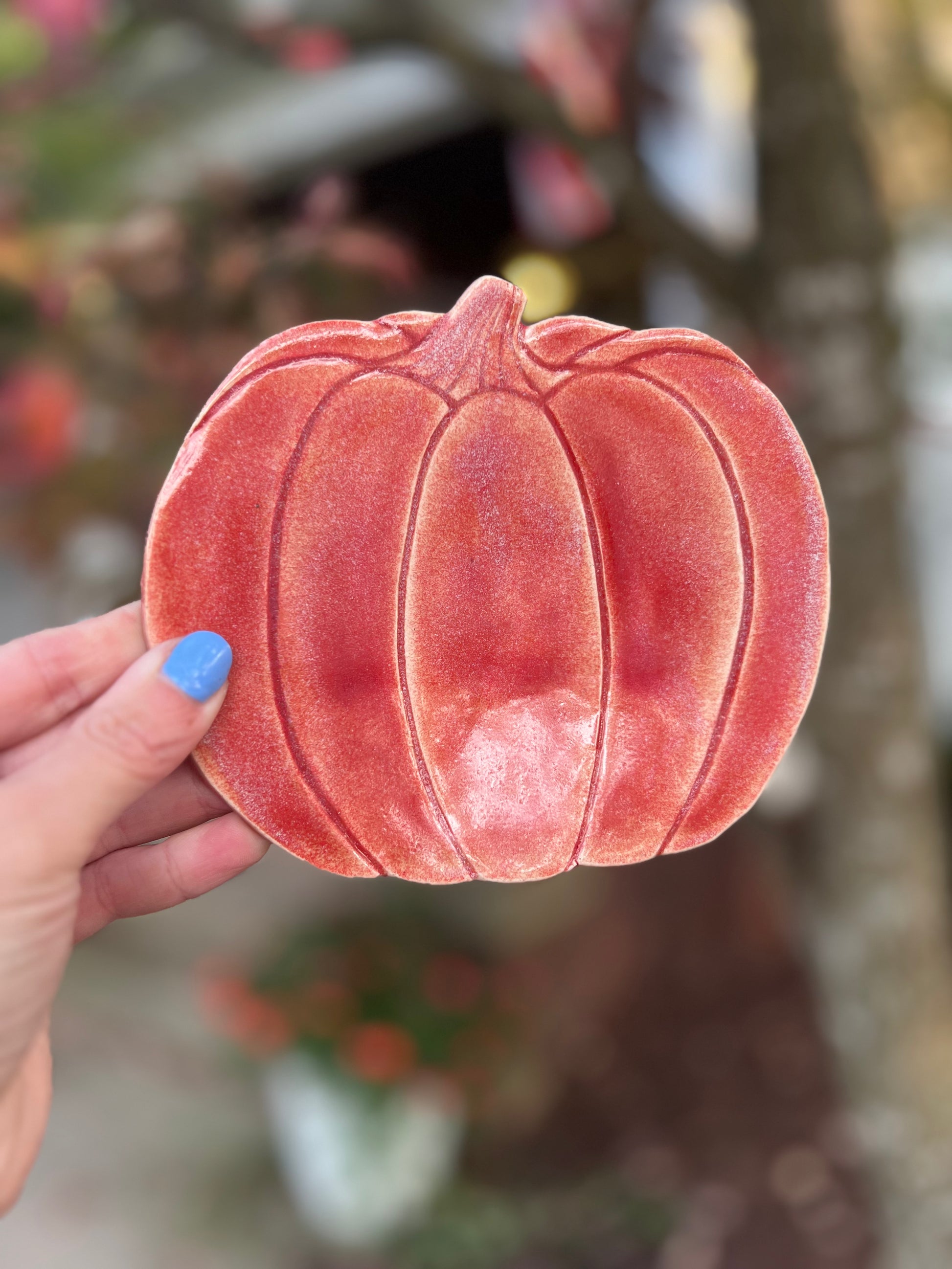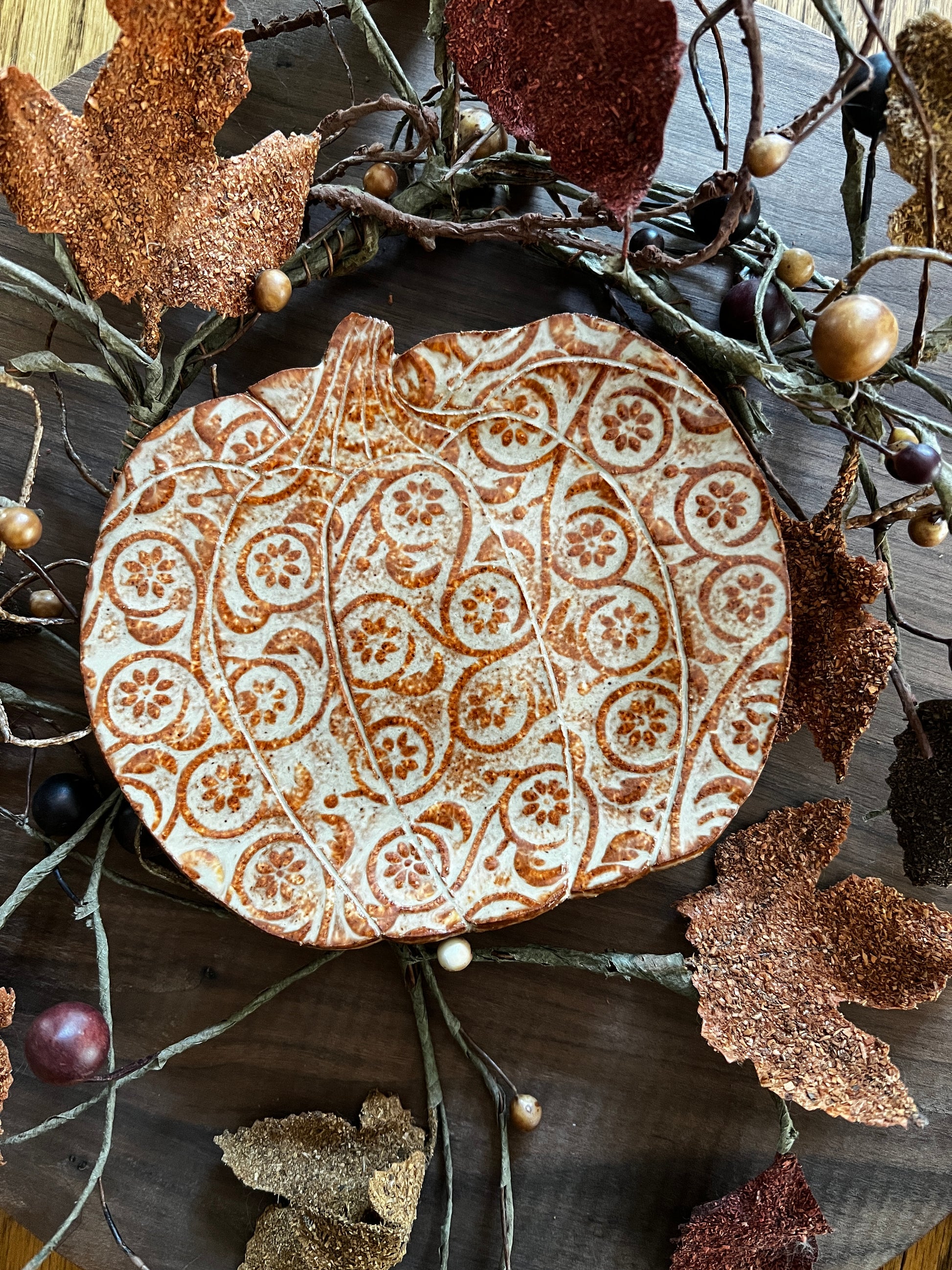 The Spiral Pumpkin is a texturized clay with a glaze that breaks brown and cream. The Coral Pumpkin has a glaze combination of Chun Plum and Alabaster.