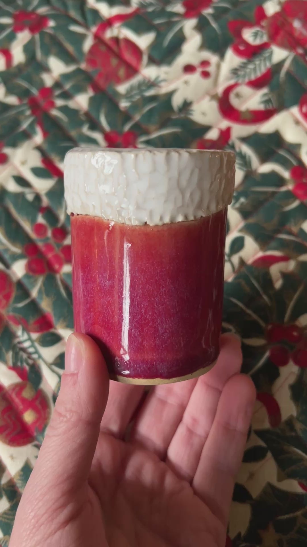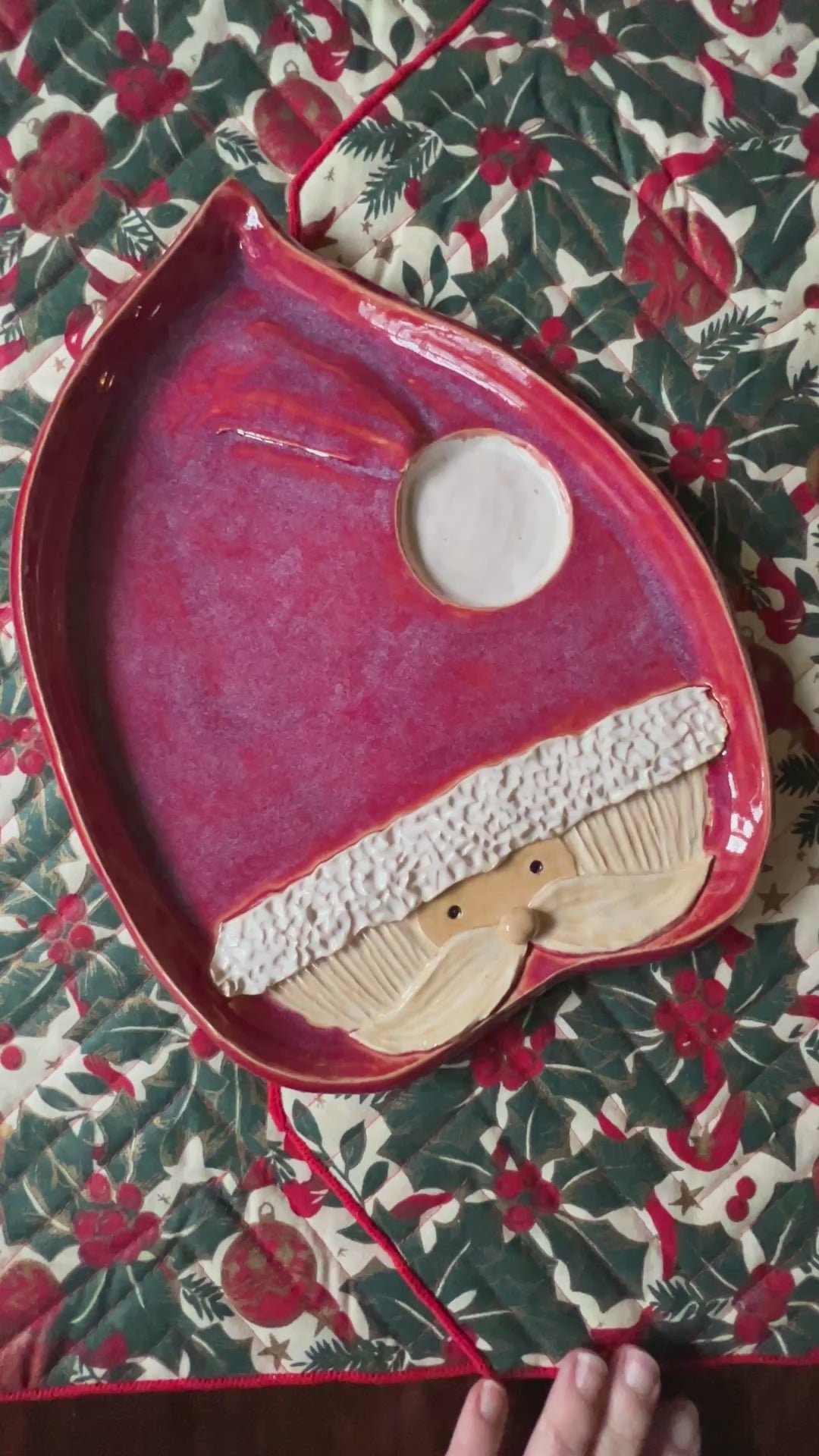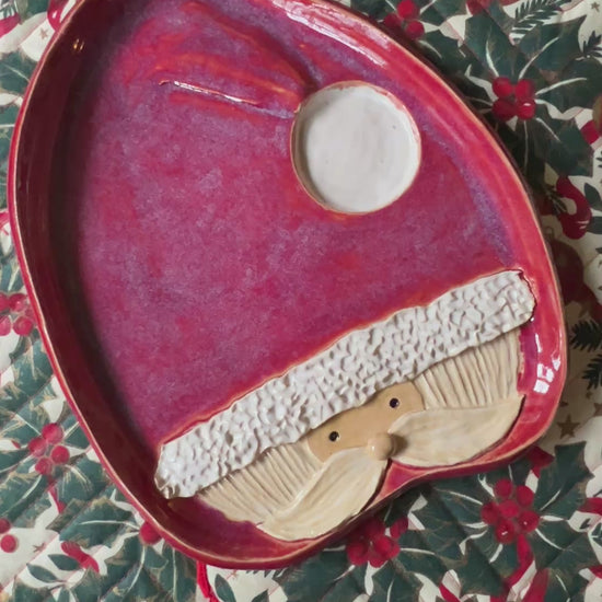 Frosty red glaze over white stoneware with a snowy white beard and charcoal black eyes.